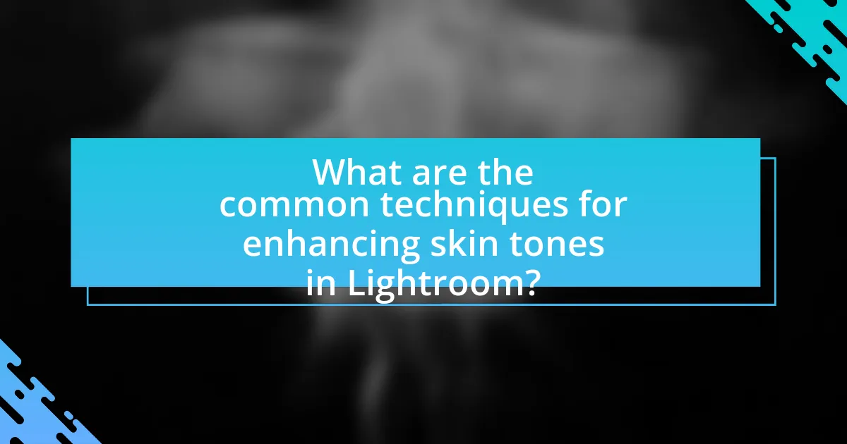 Common techniques for enhancing skin tones in Lightroom include adjusting the HSL (Hue, Saturation, Luminance) sliders, using the Adjustment Brush for localized edits, and applying the Split Toning feature. The HSL sliders allow for precise control over the color balance of skin tones, enabling users to enhance or correct hues effectively. The Adjustment Brush can be utilized to selectively brighten or smooth skin areas, improving texture and appearance. Split Toning helps in adding warmth or coolness to the highlights and shadows, further refining the overall skin tone. These methods are widely recognized for their effectiveness in portrait editing, as they provide photographers with tools to achieve natural and appealing skin tones.